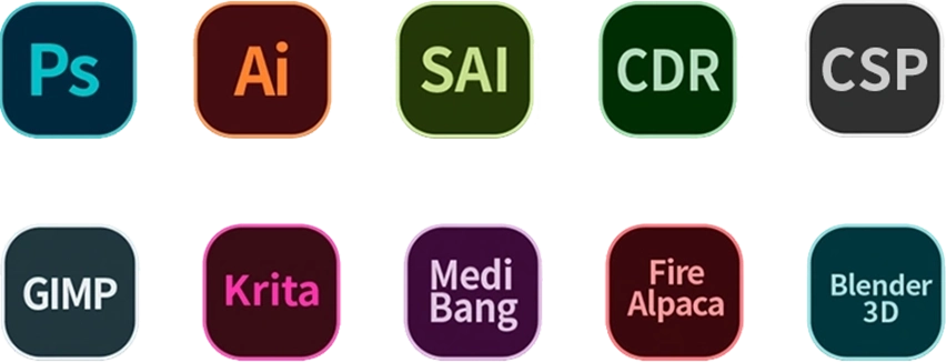 Kompatibel mit beliebter digitaler Kunstsoftware wie Adobe Photoshop, Illustrator, SAI, CDR, Clip Studio Paint, GIMP, Krita, MediBang, FireAlpaca, Toonboom, Maya und Blender3D, usw.